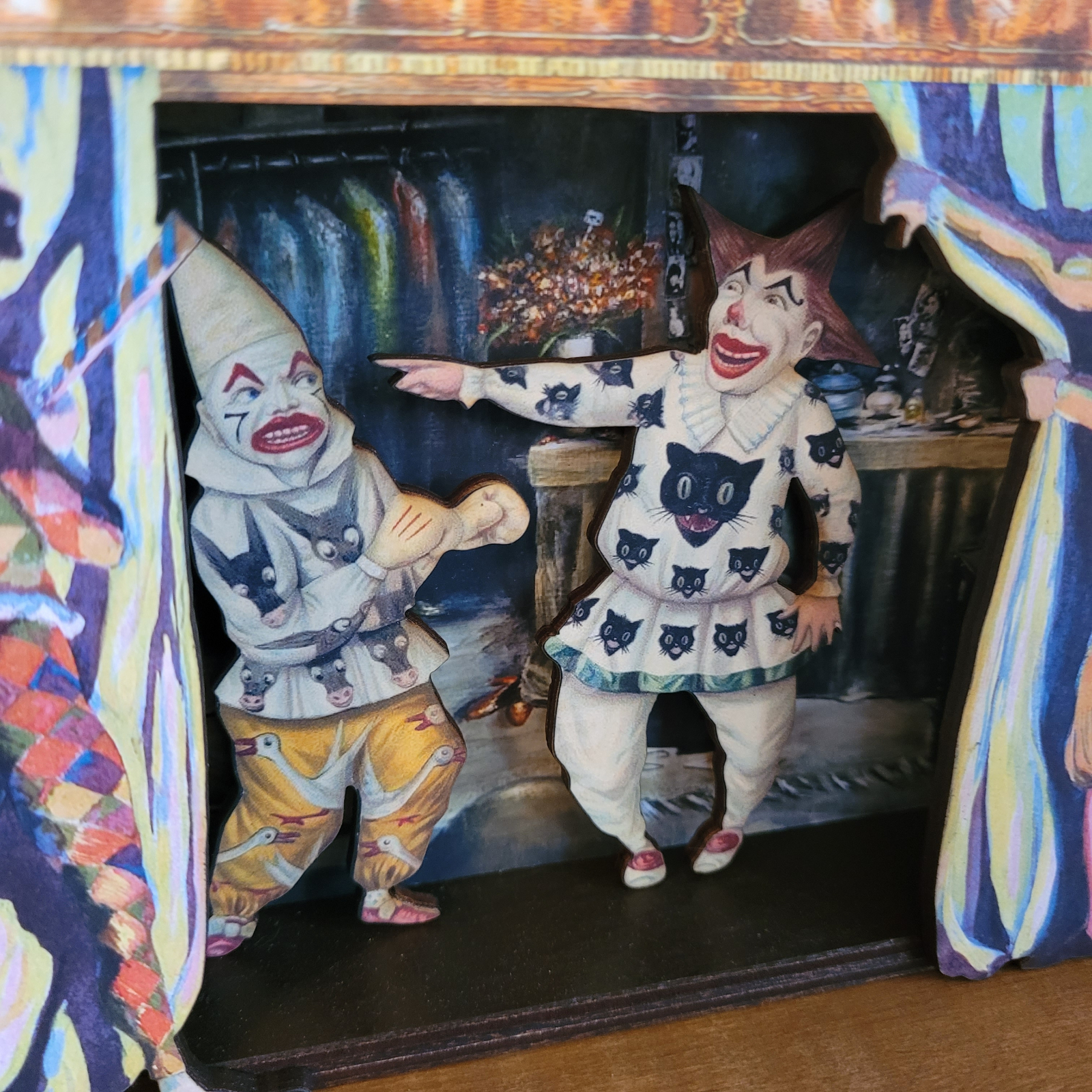CLOWN FIGHT 3-D handmade wood shadowbox artwork