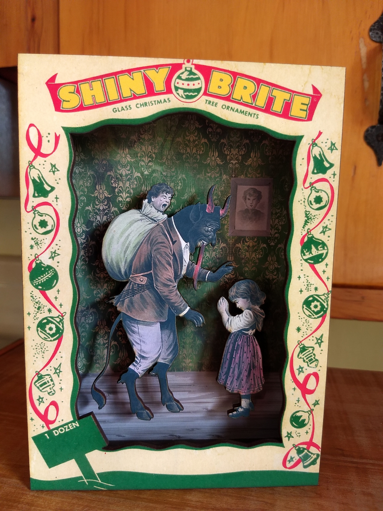 This laser cut Krampus image is from an early 1900s Austrian Christmas postcard. The frame image is of a vintage Christmas Shiny Brite ornament box.