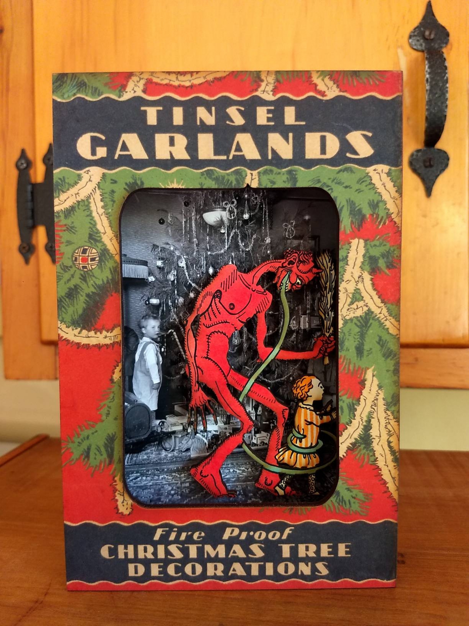 This laser cut Krampus image is from an early 1914 German Christmas postcard. The frame image is a vintage Christmas tree tinsel box lid.