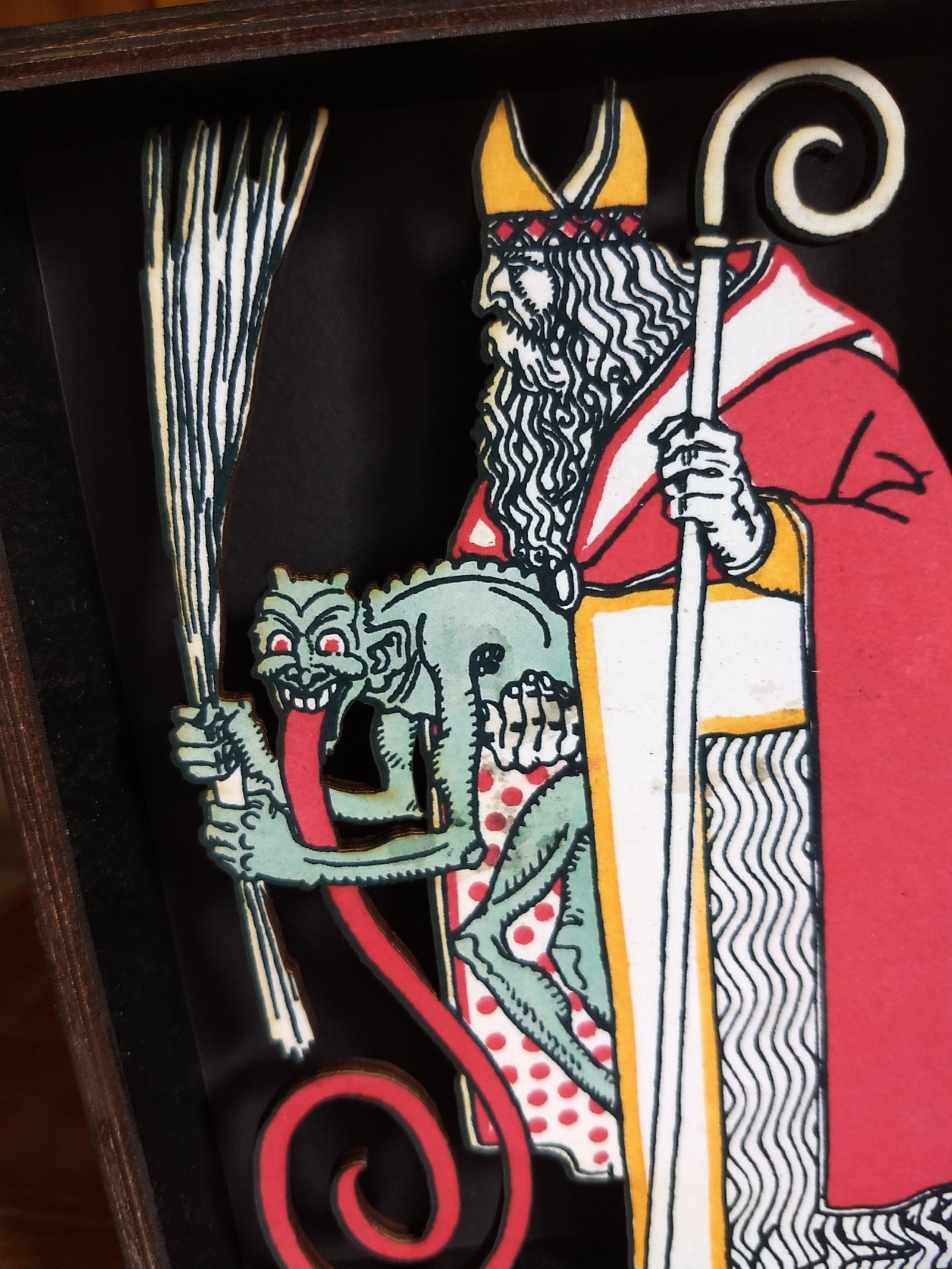 This image is from an early 1900s Austrian postcard. St. Nicholas holding an especially evil-looking Krampus.